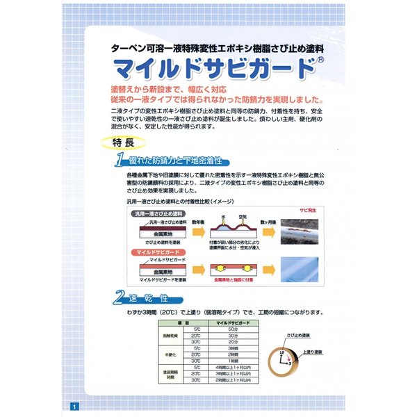 二液タイプの変性エポキシ樹脂さび止め塗料と同等の防錆力、付着性を持ち、安全で使いやすい速乾性の一液さび止め塗料が誕生しました。煩わしい主剤、硬化剤の混合がなく、安定した性能が得られます。