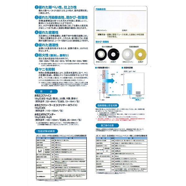 規格:JIS K 5660 つや有合成樹脂エマルションペイント(艶有り)、JIS K 5663 合成樹脂エマルションペイント 1種(艶消し)
