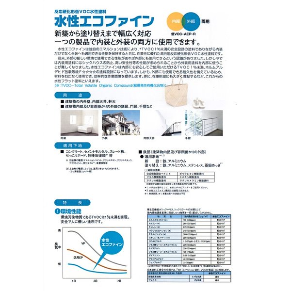 水性エコファインは独自のエマルション技術によりTVOC1%未満の安全設計の塗料でありながら内装だけでなく外装へも適用できる性能を保持すると共に、作業性に優れた高性能反応硬化型低VOC水性塗料です。