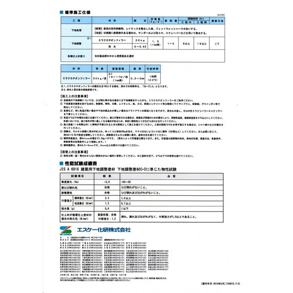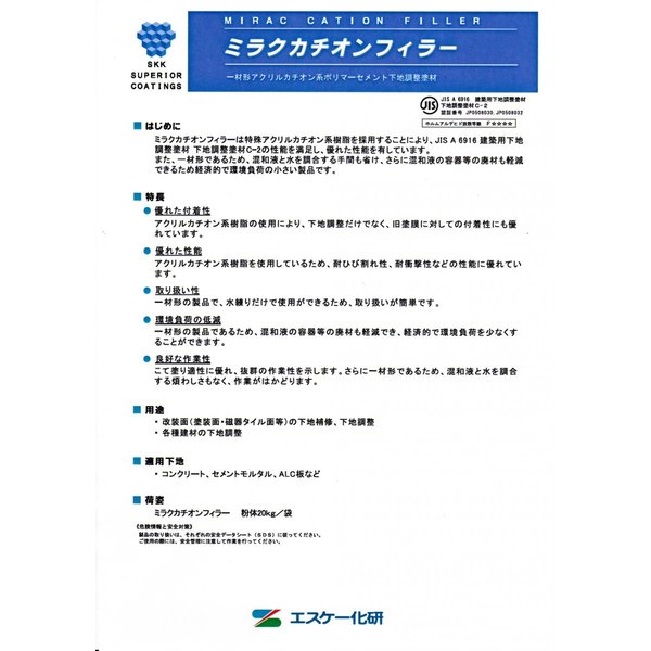 ミラクカチオンフィラーは特殊アクリルカチオン系樹脂を採用することにより、JIS A 6916建築用下地調整塗材 下地調整塗材C-2の性能を満足し、優れた性能を有しています。