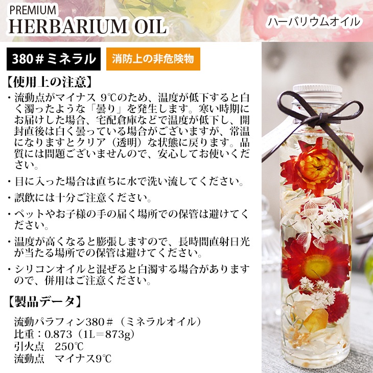 ●ハーバリウムオイルは無色透明・無臭のため、ペットやお子様の手の届く場所での保管は避け、誤飲には十分にご注意ください。目に入った場合は直ちに水で洗い流してください。