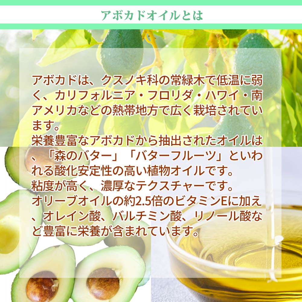 ・10℃以下で白く固体化しますが、これは天然成分の特徴です。室温で温めると再び液体に戻りますのでご安心ください。 ・電子レンジは使用しないでください。温度が上昇し、火傷の原因となる可能性があります。 ・季節やロットによって香りの強弱がある場合があります。アボカド特有の香りの為、劣化臭ではないかとご心配される方がおられますが、品質には全く問題ございません。安心してご使用ください。