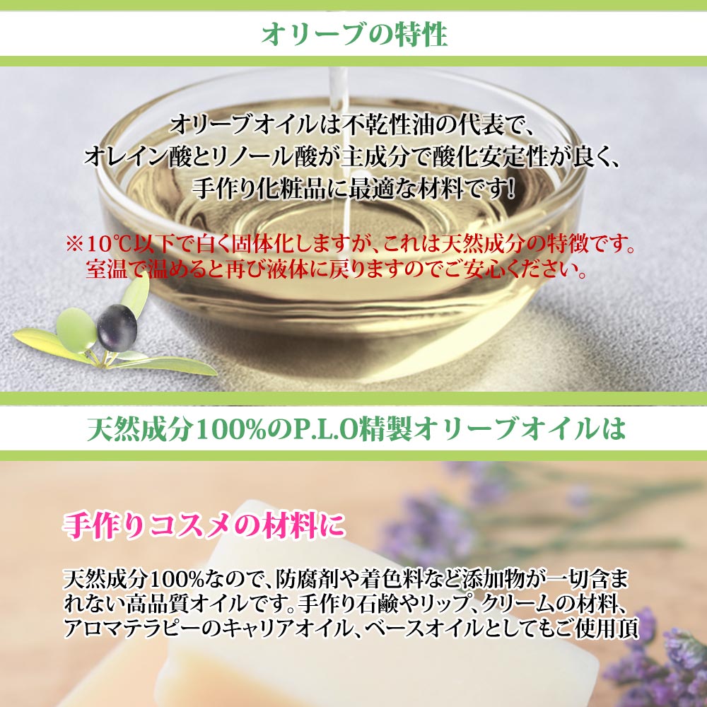 ・10℃以下で白く固体化しますが、これは天然成分の特徴です。室温で温めると再び液体に戻りますのでご安心ください。 ・電子レンジは使用しないでください。温度が上昇し、火傷の原因となる可能性があります。 ・季節やロットによって香りの強弱がある場合があります。オリーブ特有の香りの為、劣化臭ではないかとご心配される方がおられますが、品質には全く問題ございません。安心してご使用ください。