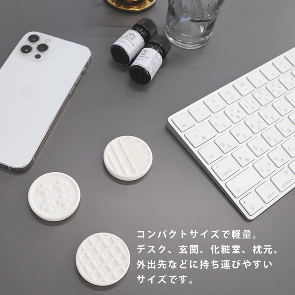 アロマストーンは電気も火も使わずに、エッセンシャルオイルを直接垂らして染み込ませ、ゆっくりと香りを楽しむ素焼きの陶器です。エンボスデザインが特徴的で、インテリアにも馴染みとてもおしゃれです。デスクワーク、玄関、化粧室、枕元などの限られた空間などパーソナルな空間での使用におすすめです。少しずつゆっくりと芳香するので、ほんのりとした香りがお好きな方におすすめです。