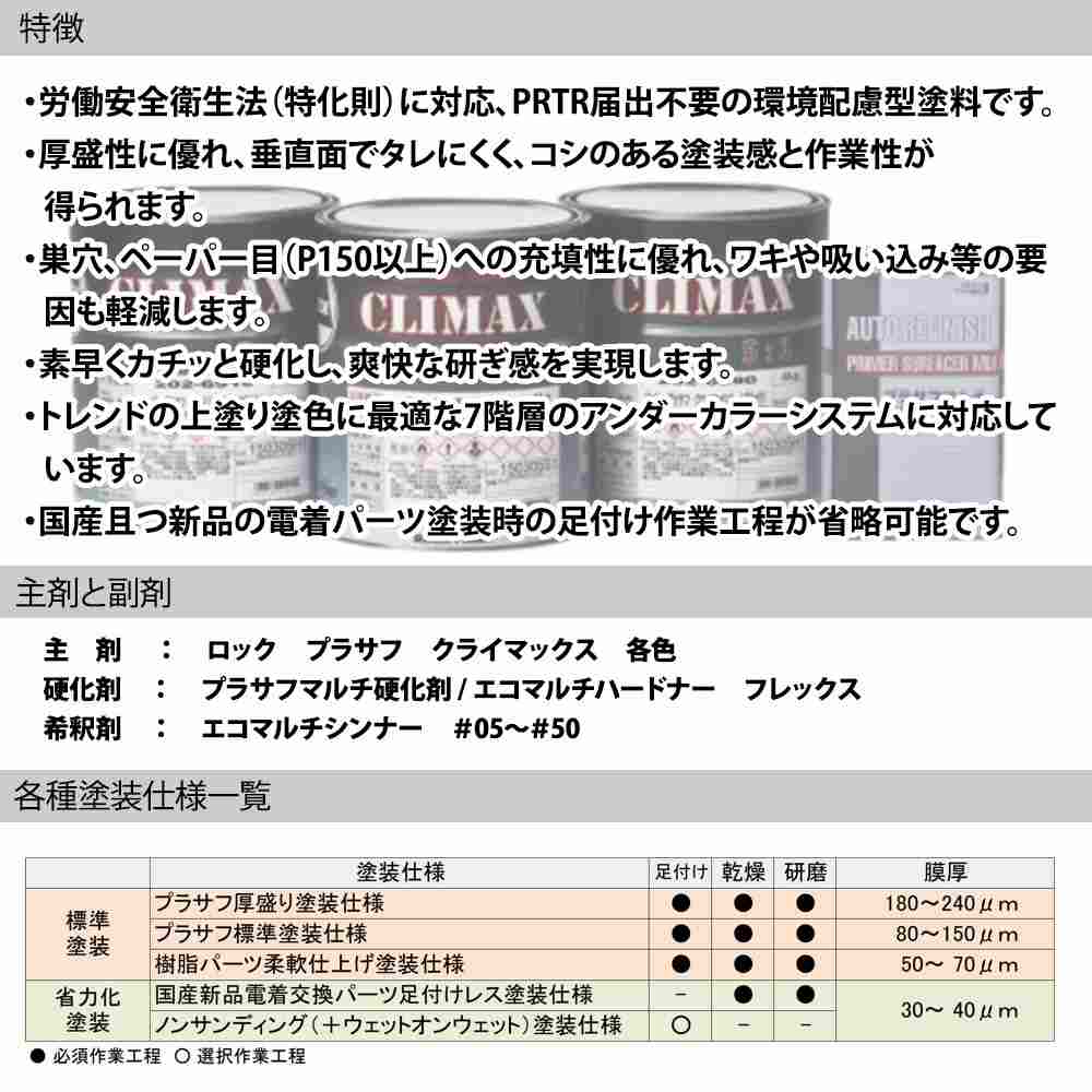 厚盛り性と充填性に優れた環境配慮型のウレタンプラサフです。垂直面での厚盛り時にも「タレにくい」塗装感と、サンディング時にペーパー目が絡まない爽快な研ぎ感を得られる、作業性の良いプラサフです。