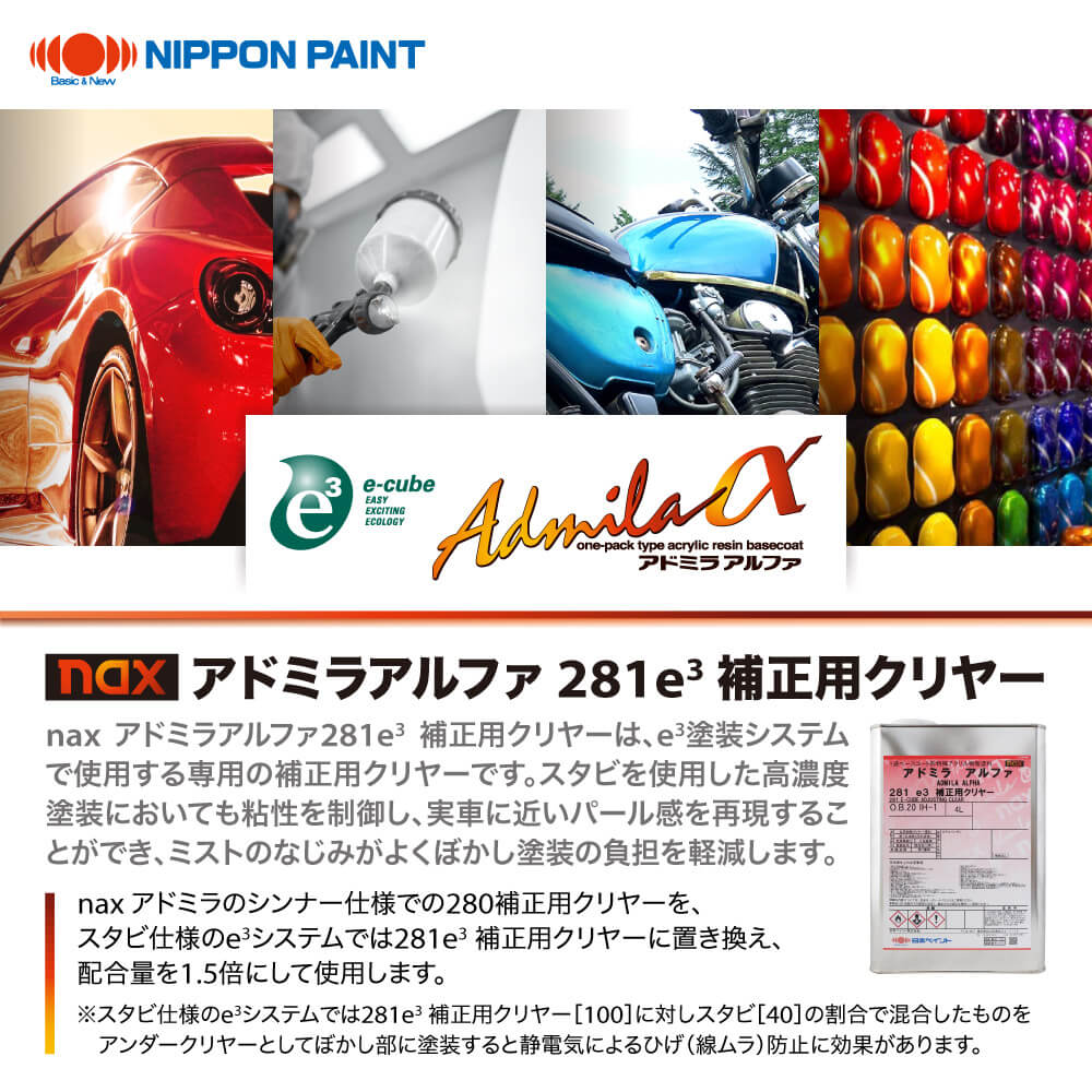 nax アドミラアルファ281e3 補正用クリヤーは、e3塗装システムで使用する専用の補正用クリヤーです。スタビを使用した高濃度塗装においても粘性を制御し、実車に近いパール感を再現することができ、ミストのなじみがよくぼかし塗装の負担を軽減します。