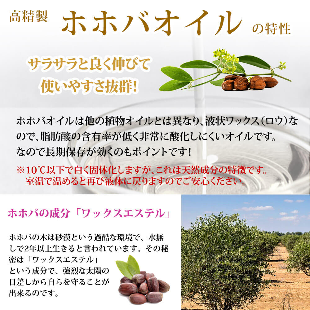 ・季節やロットによって香りの強弱がある場合があります。ホホバ特有の香りの為、劣化臭ではないかとご心配される方がおられますが、品質には全く問題ございません。安心してご使用ください。