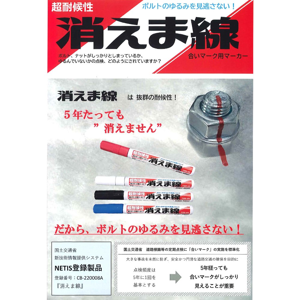 「消えま線」は耐候性に優れ、屋外でも消えずに、変色の少ないマーカーです。