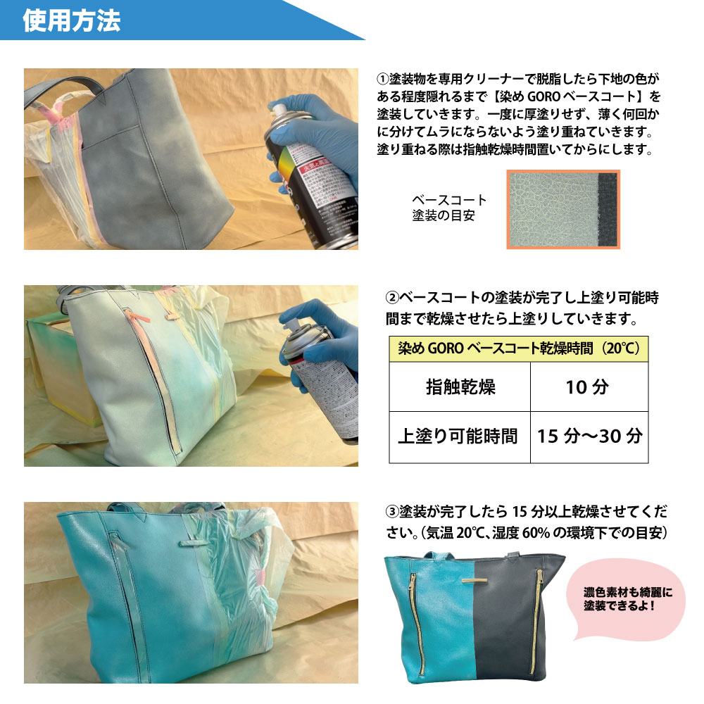 染めGORO 各種に使用できる専用のベースコートです。色の濃い下地に明るい色を塗装する際の下塗りとしてベースコートをご使用ください。